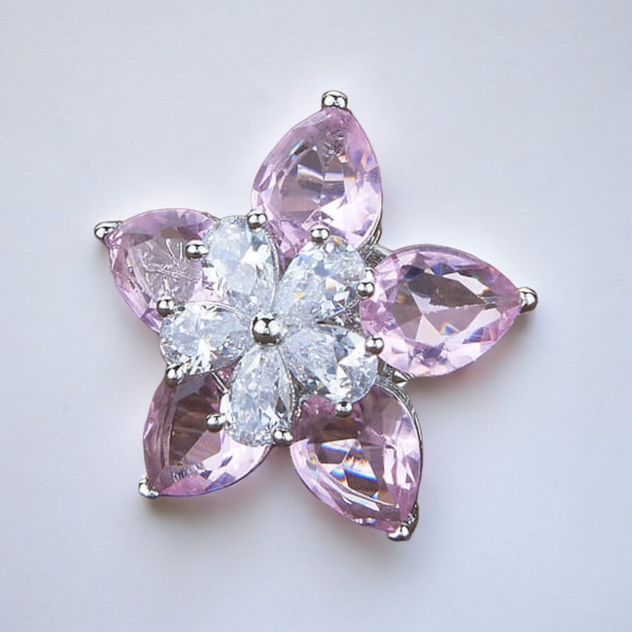 - Lustrous Pink Petals: Teardrop-cut pink stones form delicate, radiant petals.