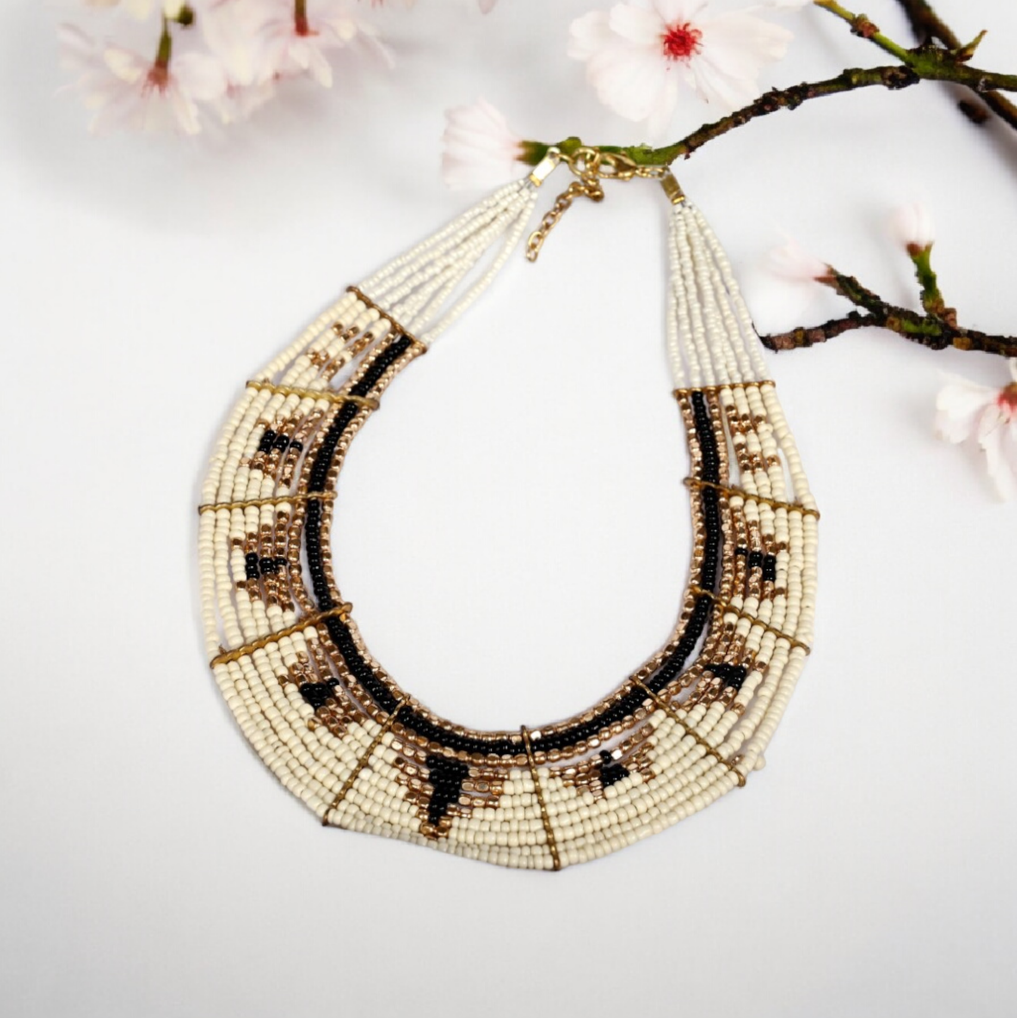 - Geometric Pattern: The necklace showcases a striking geometric pattern with black and white beads, adding visual interest.