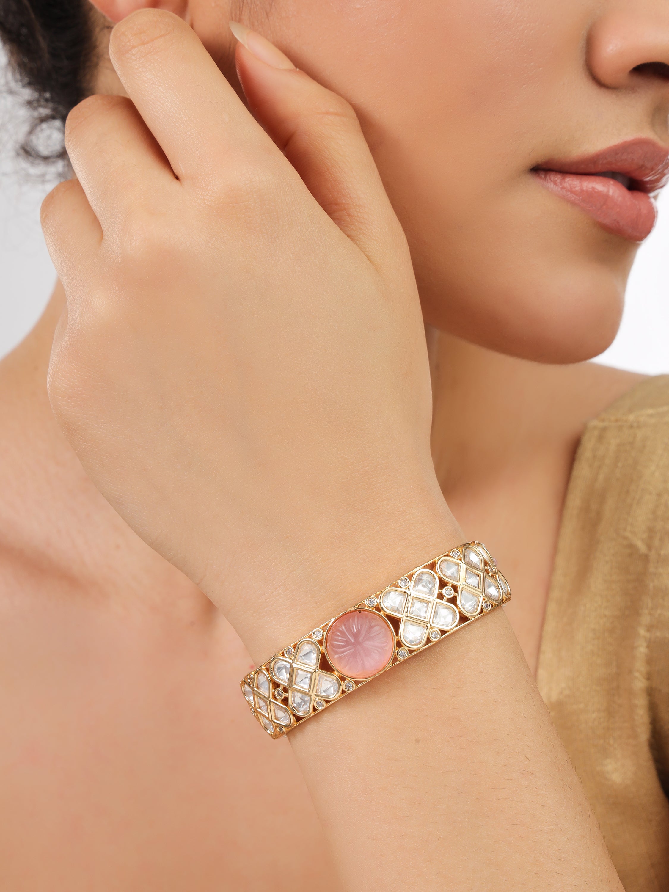 - Exquisite Craftsmanship: A beautifully designed gold-toned bracelet adorned with high-quality Kundan stones and a delicate carved pink center stone.