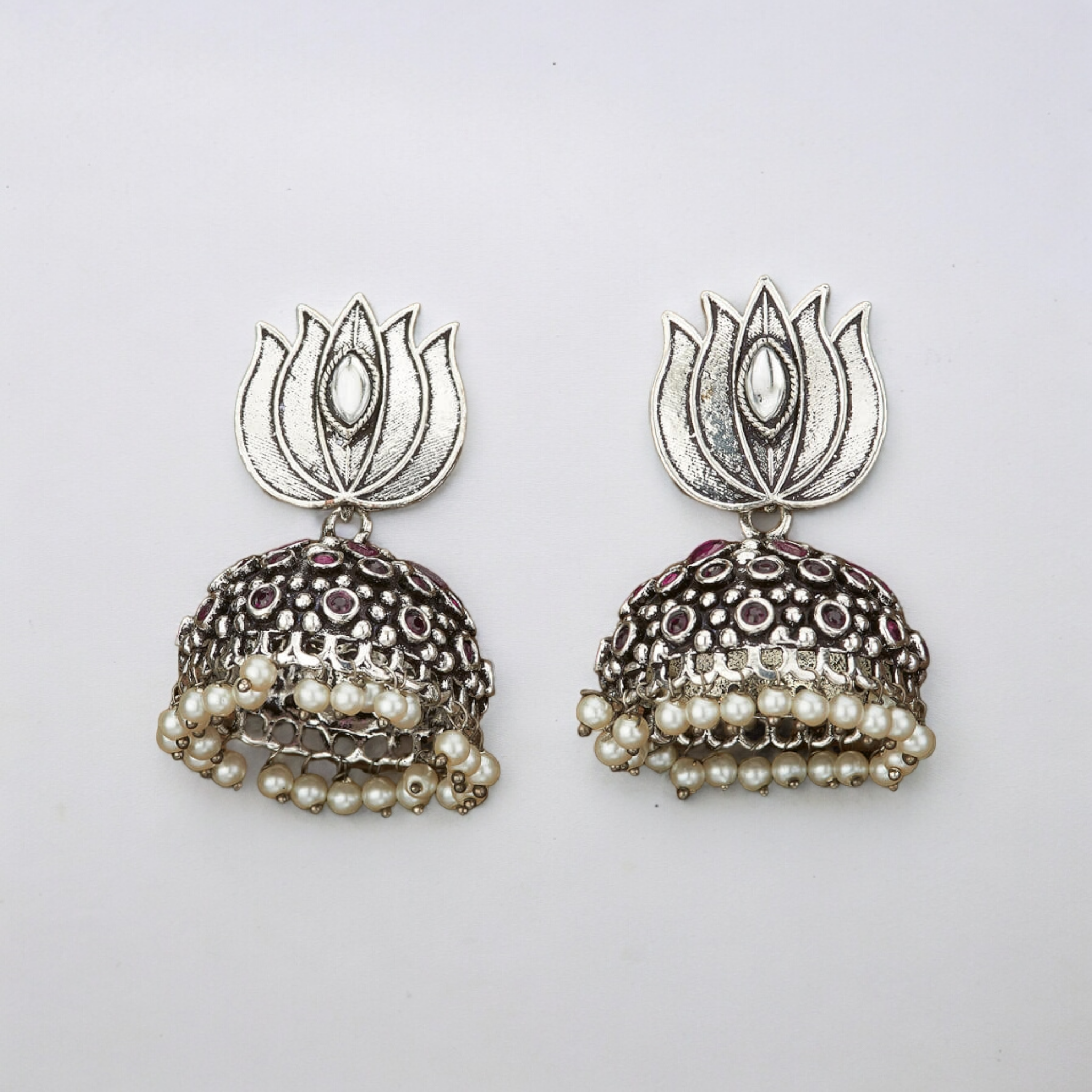 This beautiful pair of jhumki earrings is made from high-quality oxidised plating. They are crafted with delicate precision to create a timeless piece of jewelry that you will adore wearing. With their striking design and signature style, these jhumki earrings are perfect for special occasions or everyday use.