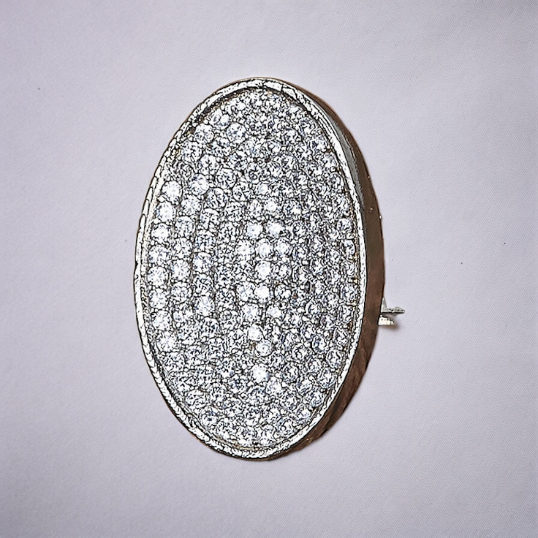 - Pave Setting: The entire oval surface is covered in a pave setting, where numerous small crystals or rhinestones are set closely together, creating a continuous sparkle.